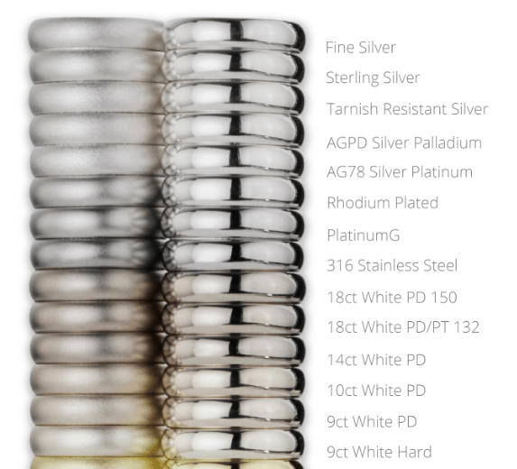 A fantastic comparison of the types of white metal available for jewellery. Note the warm grey tone of the white gold, and the similarity in colour between the Rhodium plate and Platinum.